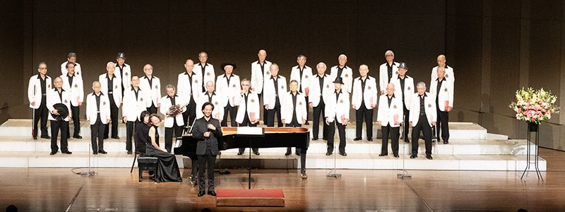 私達の男声合唱団「牧神(パン)」の29名は佐藤望先生の指揮、高須亜希子先生のピアノ伴奏で日頃の練習で鍛えた歌声をご披露しました。パンに入団して未だ日が浅い私は朝から緊張気味でしたが、リハーサル会場で望先生と母上の佐藤ゆり先生から最後のご指導と励ましを受けると緊張も和らぎ、日頃のご指導のように言葉をハッキリと声を上に響かせることと、要所で縦の線を揃えることを心掛けて一生懸命に歌いました。